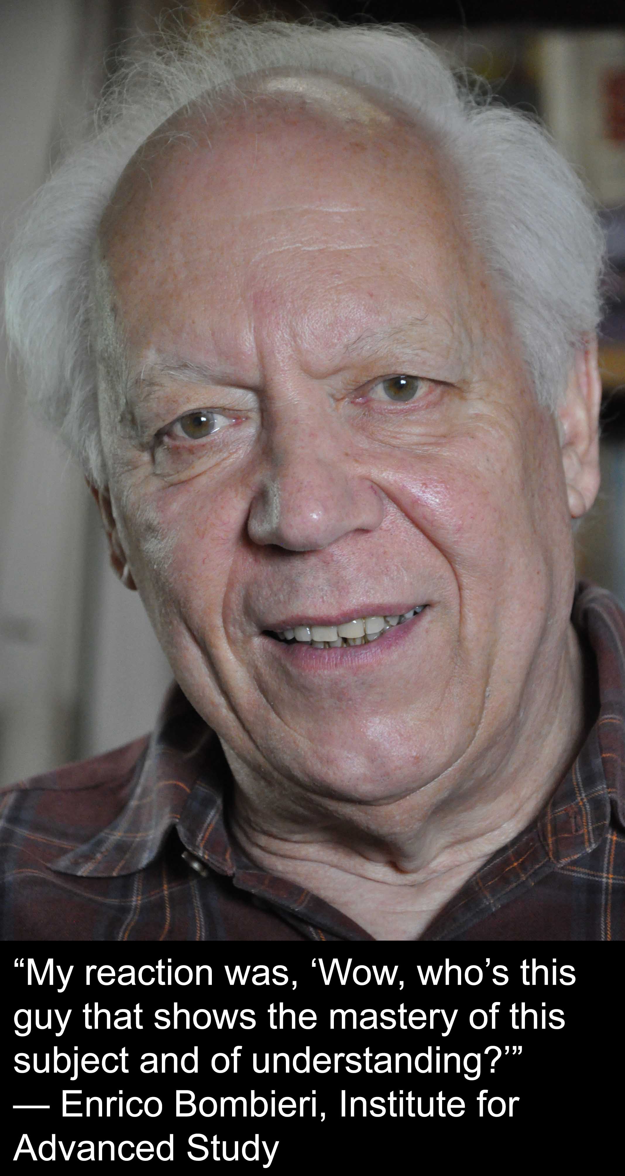 Being at the Institute provided opportunities to interview three prominent mathematicians to appear in the film. Nicholas Katz is an editor of the Annals of Mathematics, the journal that published Zhang's proof. He described how the paper went from submission through publication in record time. One of the experts to review Zhang's paper, and a key person in research on the Twin Prime Conjecture and related areas, is Enrico Bombieri. He provided a detailed history of the problem and how truly innovative Zhang's breakthrough really is. Peter Sarnak also gave us perspectives on how Zhang's work, and the more recent results of James Maynard, are changing the mathematical landscape.