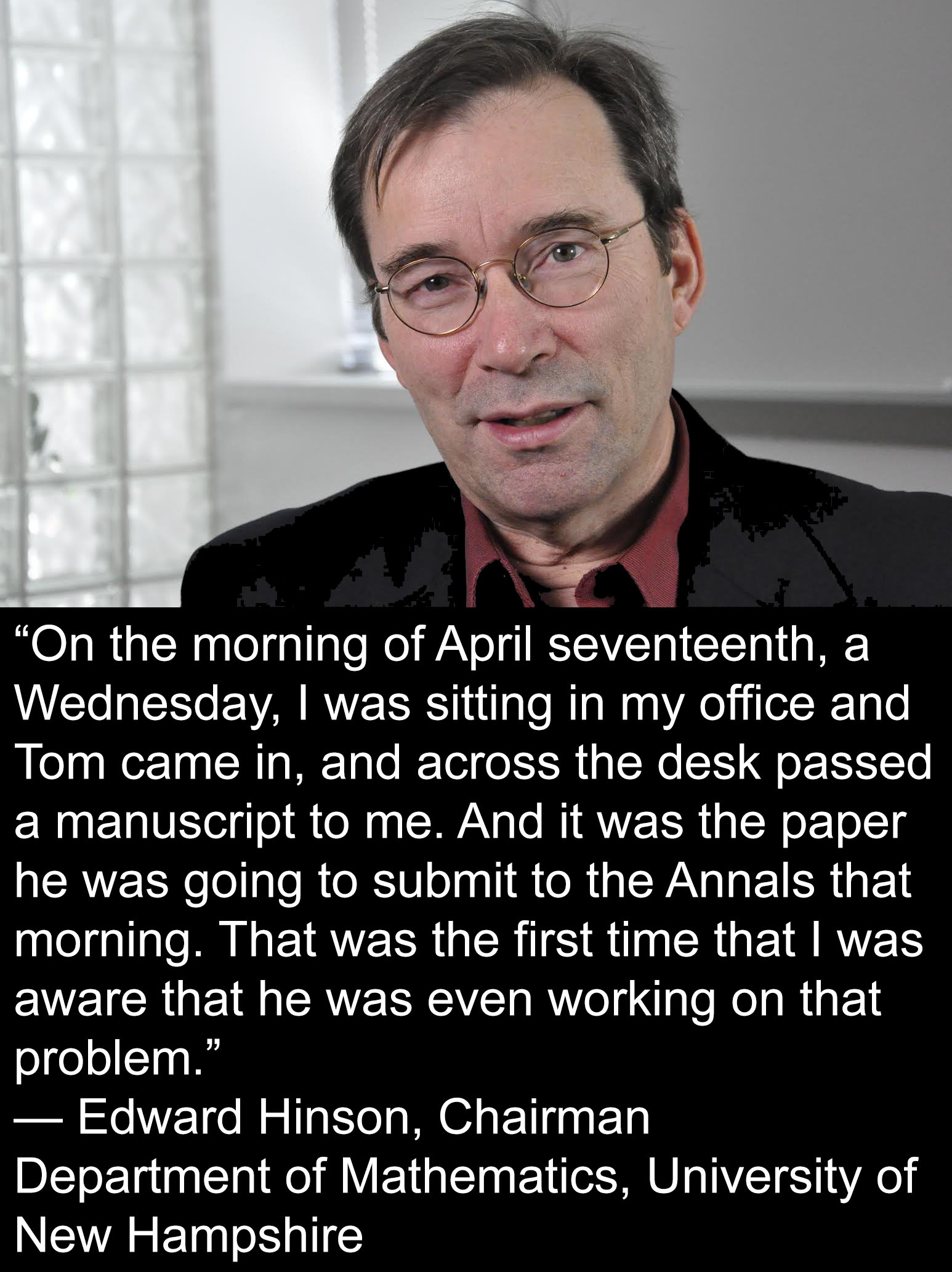 One day of filming in New Hampshire yielded a final interview with Zhang, a chance to watch him teaching a class, and interviews with UNH Chairman of Mathematics Edward Hinson, and three of Zhang's former students. Of course, Hinson and the students were extremely proud of having a celebrity in their midst, especially since in September 2014, Zhang was awarded the prestigious MacArthur Fellowship. This accolade, added to a series of prizes and offers of research positions at the world's top universities, was all the more meaningful to the students and faculty at UNH because Zhang, instead of leaving for more money and a higher status job, had chosen to return to the place where he had taught since 2000. He feels it is somewhere he can "be quiet and do mathematics."