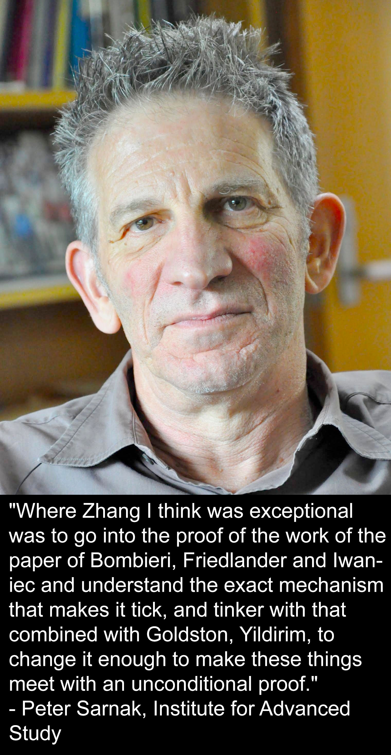 During the conversation with David Eisenbud, Zhang revealed much about his early life in China. Yitang Zhang was born in 1955, the son of an engineering teacher and a secretary. He spent a part of his childhood living with his grandmother. The persecution of his father during the Cultural Revolution resulted in his exile from Beijing. Living in the countryside with his mother with the barest of necessities and virtually no opportunity for education aside from required propaganda sessions, he taught himself mathematics and developed a lifestyle of austerity. It was during this time of severe deprivation that he learned to cultivate the inner resources that he would later bring to bear on the most challenging of mathematical problems. To this day he cherishes the simple life and eschews the lavish and extravagant.