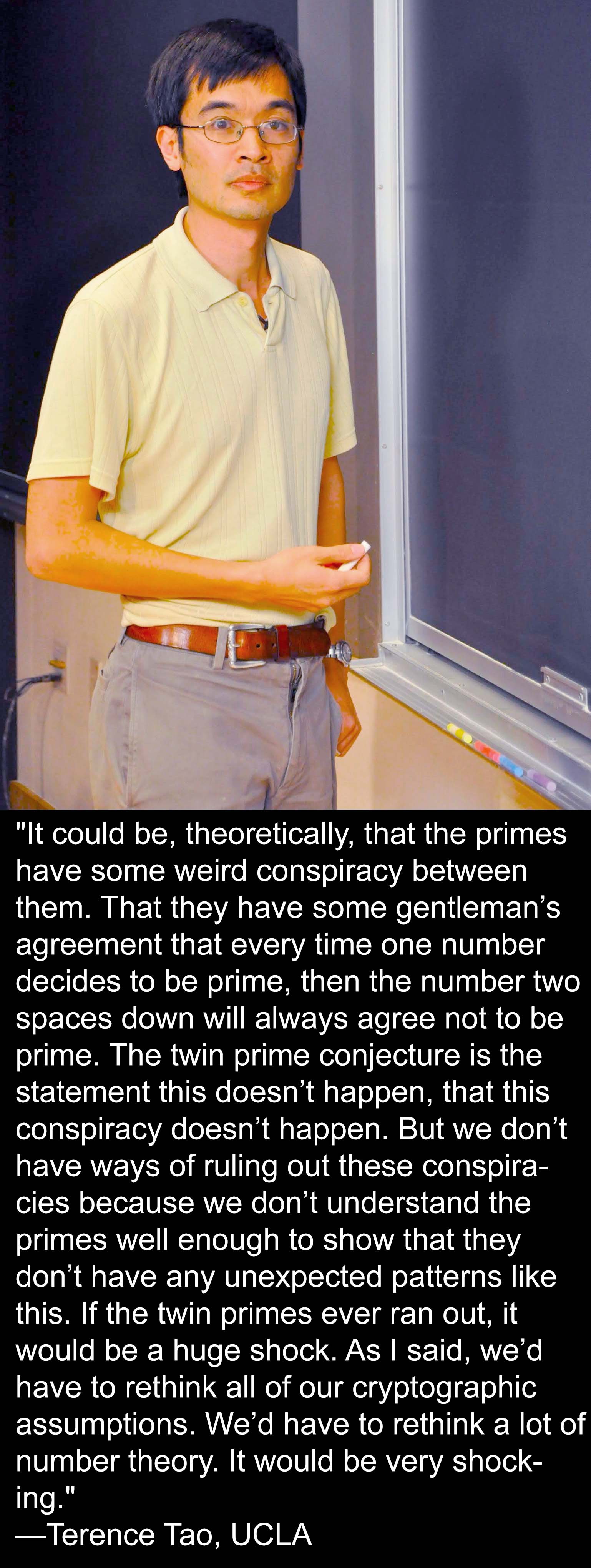 In November 2013, an interview was filmed with Terry Tao, known as one of the greatest mathematicians of our time, who had helped to organize a collaborative Polymath project to reduce the number in Zhang's proof from 70,000,000.