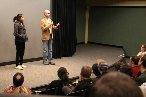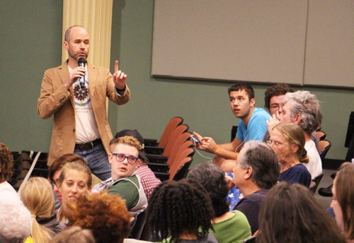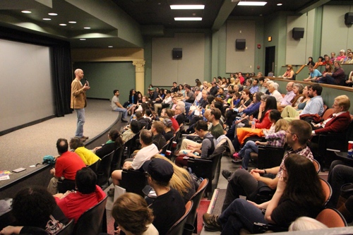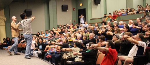 Bob Klein teaching a math puzzle to audiencePhotos by Margaret Thompson, courtesy of the Athena Cinema.