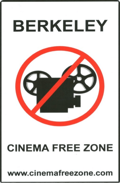 The Berkeley Cinema Free Zone sticker is simultaneously a protest item and a comment on the City of Berkeley’s penchant for attempting to ban everything under the sun, starting with the nuclear free zone initiative. In this case, it’s not as if anyone ever took a stand to rid the city of Berkeley of movie theaters. The demise of the silver screens has progressed for many different reasons, and continues, leaving gaping holes in what was once a thriving movie-going culture. The Cinema Free Zone sticker parodies this trend while bemoaning the loss of so much of the community’s cinematic heritage. It serves as a reminder of a glorious past. Whenever you see one, think back to a time when movies were everywhere.